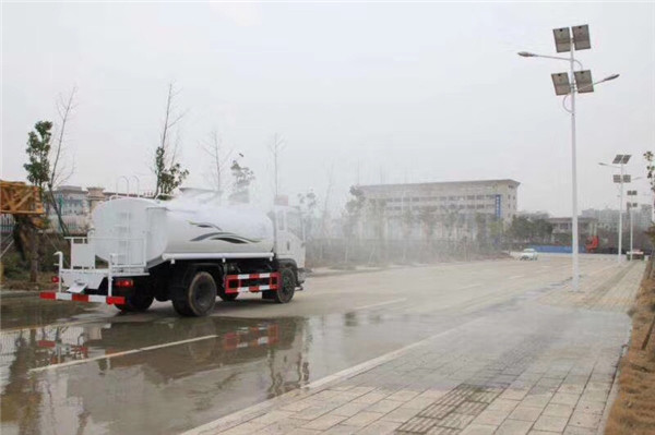 目前最受房地產歡迎的多功能灑水車為噴霧灑水車,該車除了常規的灑水車的配置以外,還加裝了一套噴霧系統,噴霧系統主要由電機,電泵和噴灑總成組成,最大作業半徑為35米,可以遙控電控,噴霧系統可以旋轉,點頭工作。噴霧系統最大電機功率高達5.5千瓦,水泵點功率6千瓦,風機攜帶18個噴霧頭,噴霧頭可更換。