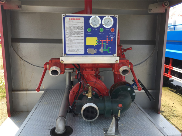 水罐消防車按功能可以分為四部分。消防車最前面的部分是駕駛室,駕駛員和指揮員坐在駕駛室中;駕駛室后面是其他消防隊員的位置。車體第一個卷簾后面擺放各種工具,包括水龍頭、消防水帶等,這些工具后面就是貯存消防用水的水箱。靠近消防車尾部的是水泵艙。顧名思義,這里是安置抽水的水泵的地方,一般水泵艙三面都有卷簾,收起尾部的卷簾還可以看到顯示水泵工作狀態的顯示屏。在水泵艙內,一般還配有使用水泵時所必須的工具。