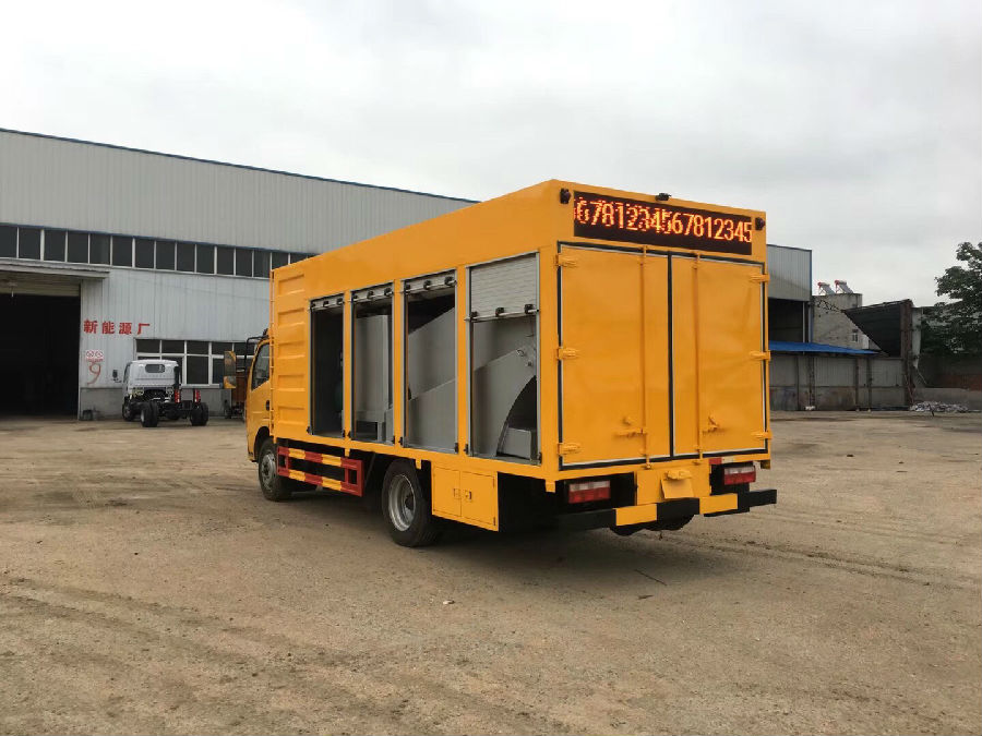污水處理車是在二類載貨汽車地盤的基礎上加裝貨箱、分離箱、藥箱、取力器、真空泵、排污泵、凸輪轉子泵、疊螺機、LED廣告宣傳屏等專用裝置改裝而成。該車結構簡單、性能可靠、操控方便,可對化糞池快速處理。