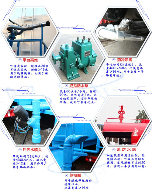 7.【東風后雙橋灑水車】罐體容積16-20方(噸),采用康明斯:210馬力發動機,帶增壓,帶方向助力,整車外形尺寸(長×寬×高):9950/2490/3200(mm),總質量:24700(kg)。配備:前沖、后灑、綠化高炮、大功率自吸自排灑水車!適合于:小區運水,廠區大面積供水綠化工作!