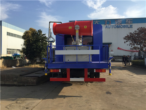 罐體后帶工作平臺,平臺上安裝的有綠化灑水炮,灑水炮和消防炮都能夠全方位360度旋轉,噴水分別可以調成直流狀、霧狀、小雨、毛毛雨。客戶可以從吸水到打水,平射,仰射,把水狀調致流狀、霧狀、小雨、毛毛雨等做了全方位的操作演練,并且打開報警裝置的操作示范,如果您的所在地在北方,那我們還可以在水泵處加裝加熱裝置,避免冬天溫度過低凍水現象的發生。