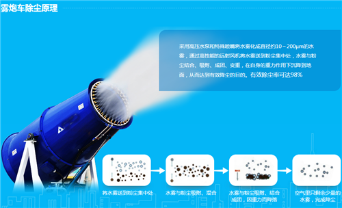 抑塵機是根據風送原理,先使用進口高壓泵、微細霧化噴嘴將水霧化,再利用風機風量和風壓將霧化后的水霧送到較遠距離,使得水霧到達較遠距離同時能夠覆蓋更大面積,水霧與粉塵凝結后降落,從而達到降塵目的。
