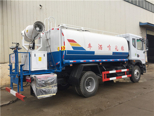 灑水車標準配置和選裝配置,有前沖、后灑、綠化澆灌、遠程水炮等裝置。采用輕質的鋁合金材料,并設置有多重安全防護裝置與報警系統。灑水車罐體采用4毫米Q235碳鋼一次鑄造成型,罐體容積12立方。