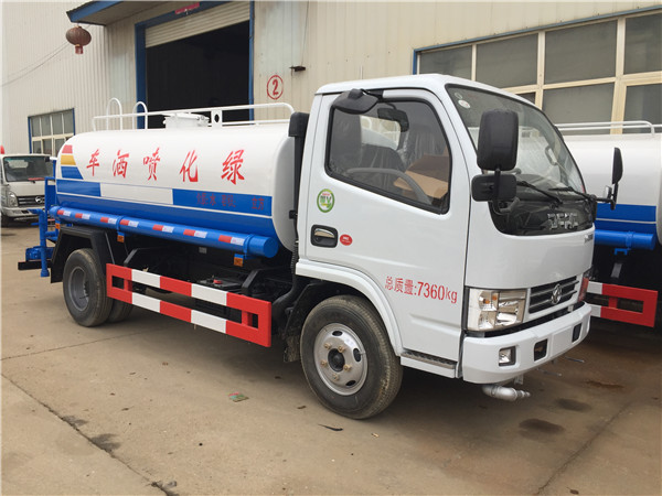 小多利卡5方灑水車(罐體容積:5立方):該車采用東風朝陽柴油發動機,一汽錫柴柴油發動機和昆明云內柴油發動機,白色前翻駕駛室,7.00-16輪胎,汽剎, 5檔變速箱,2噸前橋,4噸后橋,整車外形尺寸:長×寬×高(mm) 5990/1980/2390,總質量(kg)7360,額載質量(kg)3870。罐體有效容積:5噸,帶國家免征公告。