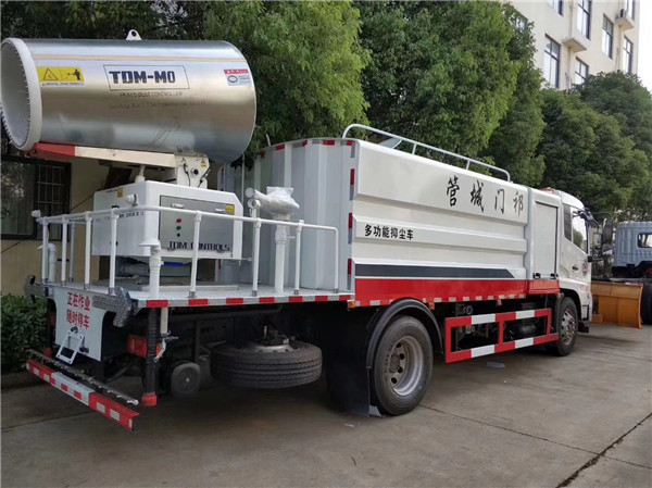 東風天錦多功能抑塵車,方形折彎箱體,容積10.3方,配專用灑水泵(可自吸自排),前沖、后灑、側噴、平臺高炮(高炮射程水平可達28米),可選裝30-120米普通霧炮,也可配置大功率全液壓霧炮(車子自身發動機通過夾心取力器帶動大功率液壓泵,從而帶動風機轉動;電動遙控控制風機左右、上下轉動和出水量)優點:功率大,噪音小,射程更遠,更加環保。