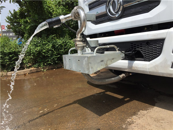 福田灑水車前裝有鴨嘴形噴嘴或圓頭沖嘴,后面裝有圓柱形灑水噴嘴或蓮蓬頭噴嘴,后部有一工作平臺,裝配有水炮。后部還可裝8個噴嘴。