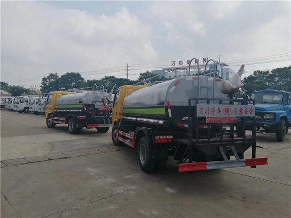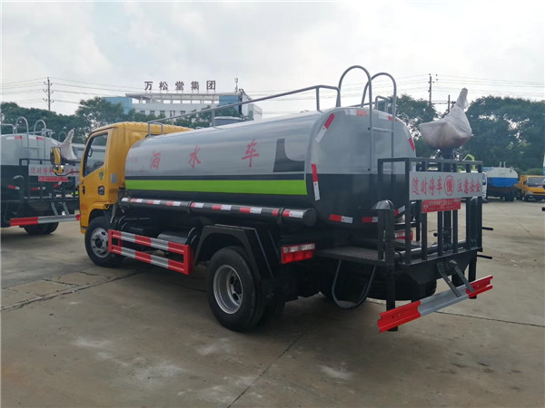 小多利卡5方灑水車(罐體容積:5立方):該車采用東風朝陽柴油發動機,一汽錫柴柴油發動機和昆明云內柴油發動機,白色前翻駕駛室,7.00-16輪胎,汽剎, 5檔變速箱,2噸前橋,4噸后橋,整車外形尺寸:長×寬×高(mm) 5990/1980/2390,總質量(kg)7360,額載質量(kg)3870。罐體有效容積:5噸,帶國家免征公告。