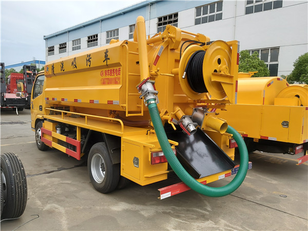 聯合疏通高壓清洗吸污車專用部分由取力器、傳動軸、真空吸污泵、壓力罐體、液壓部分,管網系統、真空壓力表、視糞窗、洗手裝置等組成,隨車配置大功率真空吸污泵和優質液壓系統,罐體封頭一次壓鑄成型、罐體可后開、雙頂自卸。罐內污物可通過后蓋直接傾倒,具有真空度高(比吸糞車的吸力更大)、噸位大、效率高、用途更廣泛的特點。