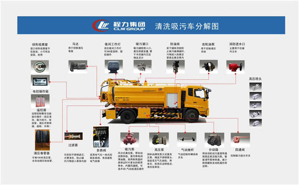 高壓清洗吸污車關鍵元件是真空泵,利用真空泵工作產生的壓力差進行抽污。安裝進口防溢流裝置,防止糞便、污水因吸滿倒灌至真空泵系統(tǒng)。