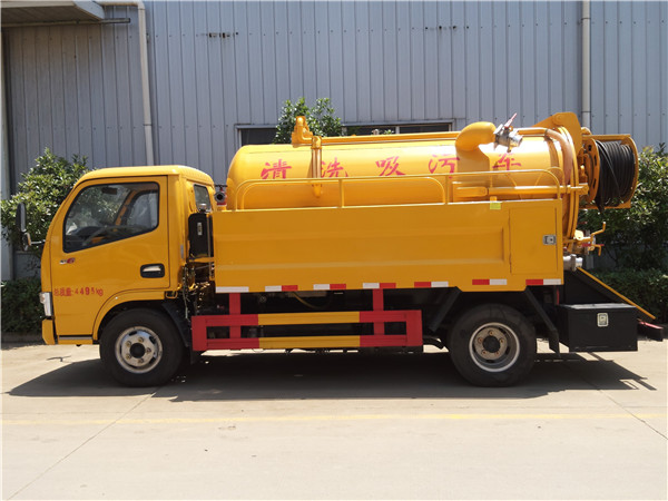 藍牌高壓清洗吸污車,車輛采用東風多利卡底盤,黃色豪華駕駛室帶空調,液壓助力離合助力,鋼絲胎,3308軸距,700鋼絲胎(帶備胎)帶ABS防抱死系統,污罐容積3.8立方(武鋼優質鋼板6個厚)水箱1.5立方(武鋼優質鋼板4個厚)配備德國品孚170L流量高壓泵,山東SK-9水循環真空泵,尾部一個100吸污口,一個100自流,尾部帶鎖緊裝置,帶水污互通,洗手裝置,其余廠家標配