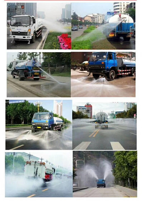 5、湖北程力灑水車前噴頭位置較低,靠近地面,噴灑壓力較大,可用于沖洗路面;后噴頭位置較高(灑水車后噴頭一般左右各安裝一個),灑水面較寬,可用于公路施工灑水,使用后噴頭時,應將前噴管關閉;使用可調噴頭灑水時,灑水寬度可根據需要調整。灑水寬度越寬,中間重疊量越少,灑水密度越均勻。