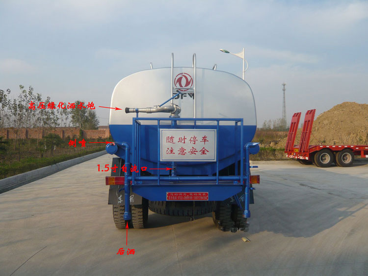 - 灑水車后灑功能:后灑一般適用于工程路面灑水,如新修的公路為防止路面干燥速度過快,造成炸裂現象,通常用在新修的路面上鋪設遮蓋物,并定時灑水車,以保持新路面的濕潤。
