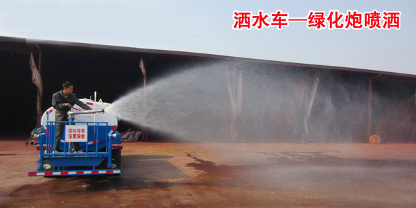 多功能灑水車帶前沖、后灑、帶側(cè)噴、帶后工作平臺(tái)。灑水車后工作平臺(tái)上安裝綠化灑水高炮。高炮可360°旋轉(zhuǎn),可連續(xù)調(diào)成直沖狀、大雨、小雨、毛毛雨、霧狀等多種形態(tài),并配備專用大功率灑水泵,帶消防接頭,帶自流閥,帶自吸功能。灑水車垂直吸程≥6米,灑水寬度≥14米,高炮射程≥28米。