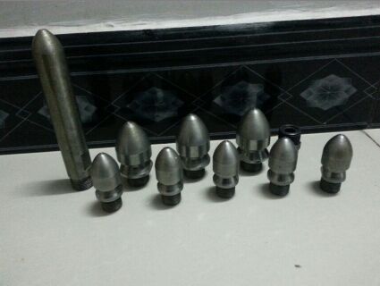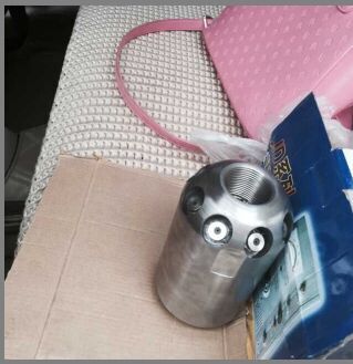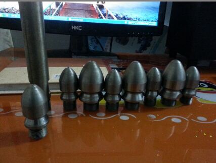 除了直噴頭以外,每個(gè)噴頭都有向后的6個(gè)噴射孔(一邊穿透、破碎、攪拌堵塞物,一邊推動(dòng)噴頭和耐高壓水管前進(jìn)),其中2、3、5、8號(hào)另外,還有一個(gè)前噴孔(穿刺堵塞物并作為導(dǎo)引孔)。