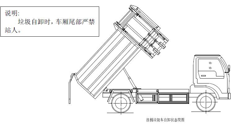 將提升操作手柄推至收回位置,箱體右側提升機油缸或頂端上蓋開蓋油缸收回,使提升機帶動垃圾桶向下回落并放置于地面,松開操作手柄使其回到中位,完成一次載,然后松開取力器,該車可以運輸行駛。另注意:箱體內(nèi)若加裝小刮板,請按操作指示牌的方向推動手柄,使刮板推出,將箱體前端的垃圾推刮到箱體后部,并且在再次裝載垃圾前將手柄反向拉回,使刮板收回,手柄回中位;以防止垃圾倒入刮板和箱體前端而被卡??;若箱體內(nèi)沒有加裝小刮板,為防止垃圾僅僅裝在箱體前端,這時可將自卸操作手柄推至開啟位置,箱體底部自卸油缸伸出,使箱體繞自卸翻轉座旋轉舉起一定角度,使箱體前端的垃圾因自重而滑到箱體后部,完成后將操作手柄反向拉回或回中位,箱體下落放平松開手柄。