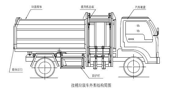 程力專用汽車掛桶式垃圾車(以下簡稱垃圾車)是用于城鎮(zhèn)內(nèi)的垃圾收集、轉運、卸料作業(yè)的專用車輛。該車是由汽車底盤、自卸油缸、提升機總成、頂蓋(選裝)、附車架、垃圾箱體等組成。該車操作由液壓控制系統(tǒng)來完成,控制方式可以為手動或電氣控。該車主要用于城鎮(zhèn)垃圾的垃圾收集、轉運和卸料。操作開提升控制閥將垃圾桶隨提升機向上升起并翻轉傾斜,桶內(nèi)垃圾被倒入車廂內(nèi)完成垃圾單次裝載,反向操作提升控制閥,垃圾桶隨提升機而放下;完成垃圾裝載后再進行傾卸時,操作自卸控制閥,垃圾箱繞后翻轉軸傾斜體舉,箱體后門打開,垃圾傾卸出箱體;起該車由液壓控制系統(tǒng)來完成該車的提升機的上升和下降及垃圾的自卸功能,降低了工人的勞動強度和改善了工作環(huán)境。該垃圾車的收運方式是目前國內(nèi)泛采用的垃圾收集轉運方式,其專用裝置的功能均以汽車發(fā)動機為動力,通過液壓機構手動或電控、氣控來實現(xiàn)。車輛的箱體采用優(yōu)質(zhì)炭鋼板全密封焊接結構,具有強度高、重量輕,防塵、防溢不產(chǎn)生二次污染等優(yōu)點。垃圾車整車基本性能與原底盤車相同,用戶請參閱原底盤車使用手冊。本用說明書僅介紹專用改裝部分的有關操作、檢查和維修保養(yǎng)。在使用車輛前,我們強烈要求您能夠通讀本說明書,并對其中的操作程序做到得心應手。我廠對產(chǎn)品將會進一步改進。產(chǎn)品的改進、性能的提高、結構的不斷完善恕不另行通知,從而有某些說明不適用于您的特定車輛,敬請諒解。